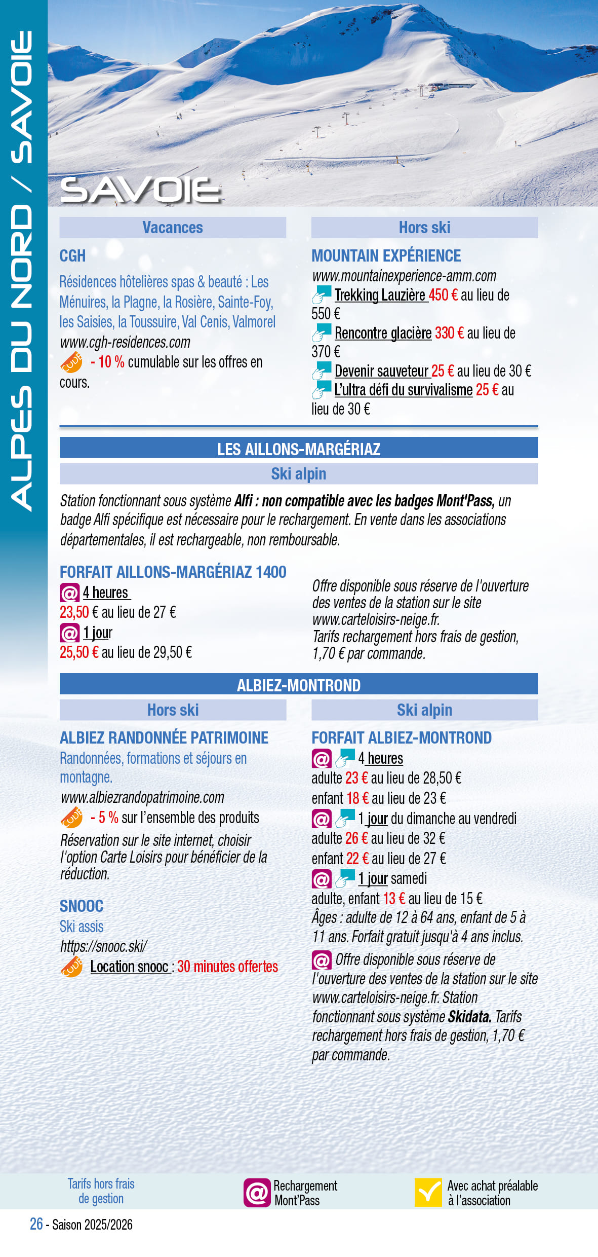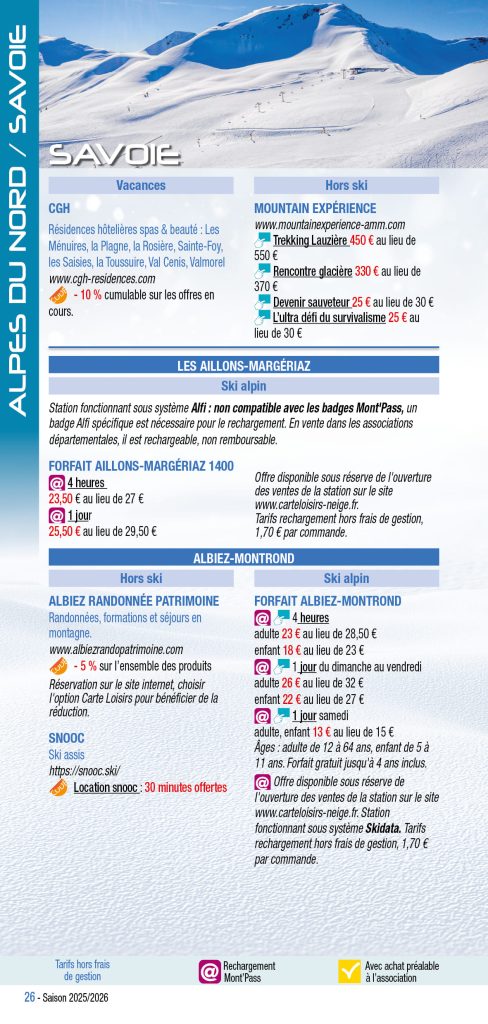 * Station fonctionnant sous système Alfi : non compatible avec les badges Mont’Pass, un badge Alfi Aillons-Margériaz spécifique est nécessaire pour le rechargement. En vente dans les associations départementales, il est facturé 2 € par la station, rechargeable mais non remboursable. Vous pouvez utiliser votre badge Alfi Aillons-Margériaz si vous en avez déjà un. Attention, les badges Alfi d’autres stations ne sont pas utilisables..