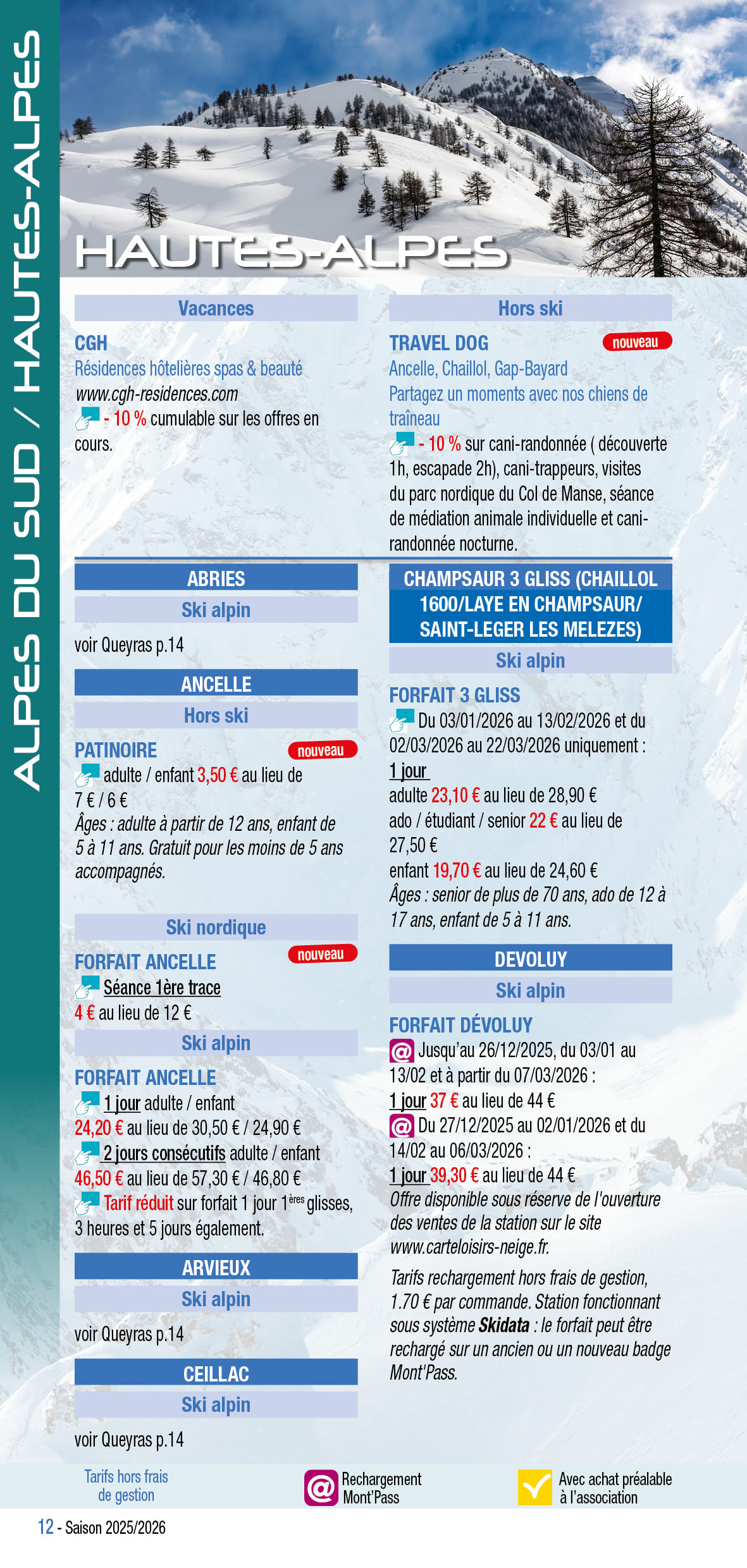 > La station peut proposer, lorsque ce n’est pas référencé ci-dessus, des tarifs complémentaires (enfant, senior…) qui ne font pas partie de l’offre Mont’Pass, dans ces cas-là les tarifs mis en ligne sont le plus souvent des tarifs publics.