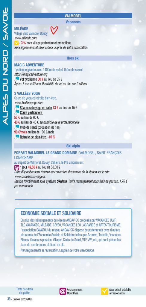> La station peut proposer, lorsque ce n’est pas référencé ci-dessus, des tarifs complémentaires (enfant, senior…) qui ne font pas partie de l’offre Mont’Pass, dans ces cas-là les tarifs mis en ligne sont le plus souvent des tarifs publics.